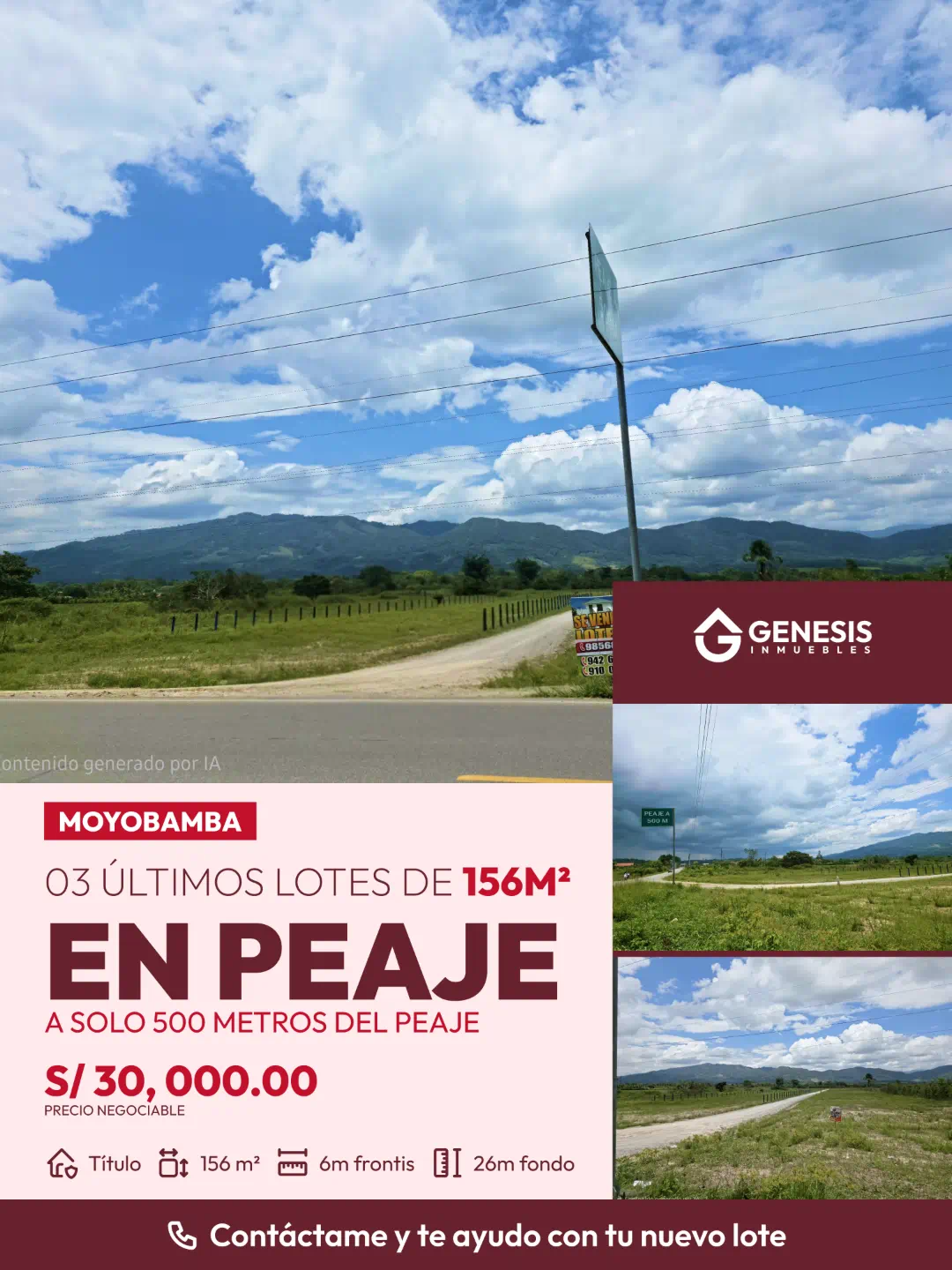 Excelente oportunidad de inversión en zona estratégica. Se venden los últimos 3 lotes de 156 m², ubicados a solo 500 metros del Peaje de Moyobamba, con acceso directo al filo de la pista, lo que garantiza fácil ingreso y alta visibilidad.